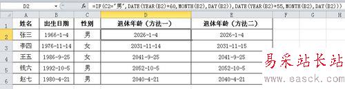 函數公式=IF(C2="男",DATE(YEAR(B2)+60,MONTH(B2),DAY(B2)),DATE(YEAR(B2)+55,MONTH(B2),DAY(B2)))“