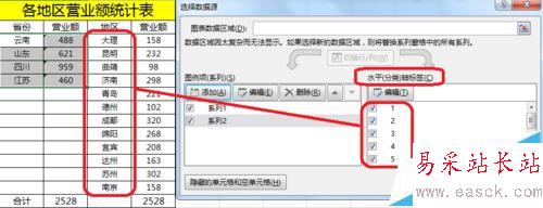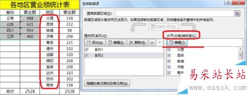 5、點擊圖表工具——設計——選擇數據。水平(分類)軸標簽——編輯——選擇(地區:大理,昆明.....)。