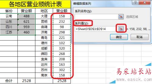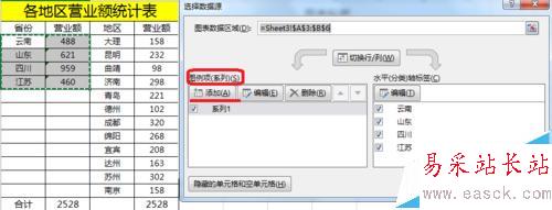 3、進行圖例項(系列)設置——點擊添加——系列值(選中營業額)。