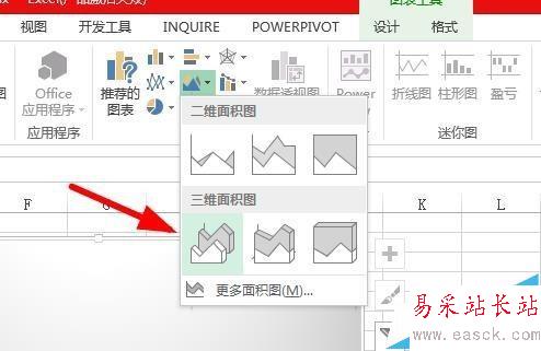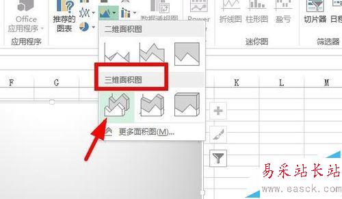 3、在圖示的案例中,我們選擇“三維面積圖”,在圖示的箭頭處單擊一下三維圖即可。