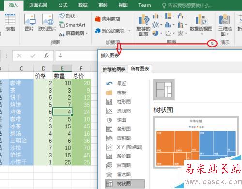 3、也可以“插入”選項卡——>“圖表”組右下角的小箭頭,會彈出“插入圖表”對話框;然后點擊“所有圖表”選項卡——>“樹形圖”——>確定。