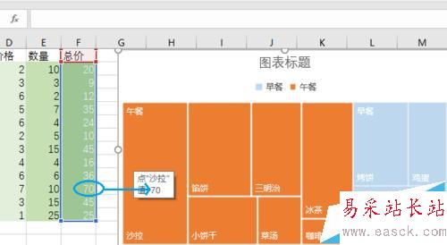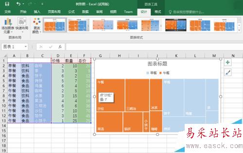 4、樹形圖就插入好了。可以看到,這種圖表用顏色區分不同的大類——早餐和午餐;每種大類里面,各小類則用大小不同的矩形來代表。