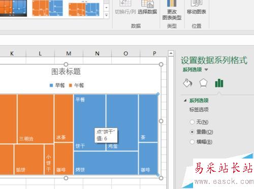 9、樹形圖還有另外一種形式。在上述步驟中,我們會發現,“早餐”和“午餐”這兩個大類的名字,是被放置到各自大類中占比最大的那個小類里的。我們可以點擊屬性圖里的矩形,Excel 會在右側彈出“設置數據系列格式”任務窗格。