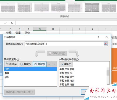 6、彈出“選擇數據源”對話框,我們在其左側點擊“價格”標簽,然后點擊上方的“刪除”按鈕。