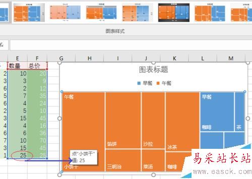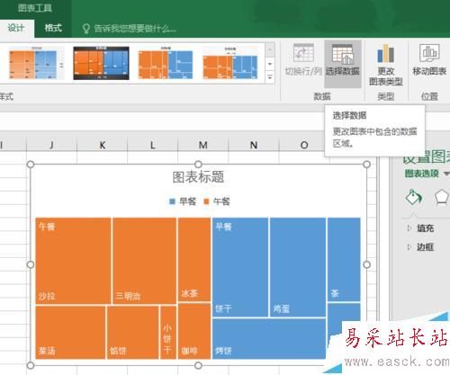 5、現在有個問題:那就是各個矩形的標簽源自數據表里的“價格”一列。而我們要看的是銷量或銷售額的情況。為了更換圖表的數據來源,我們點擊圖表,然后點擊“設計”選項卡——>“數據”組里的“選擇數據”按鈕。