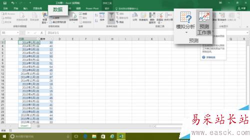 2、確保活動單元格處于數據表內,然后依次點擊“數據”選項卡——“預測”組——“預測工作表”按鈕。