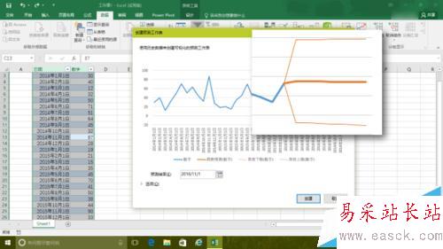 3、彈出“創建預測工作表”向導窗口。窗口為我們呈現了歷史數據和未來預測數據的圖表,其中藍色折線是歷史數據,橙色折線是未來預測數據。可以看到,表示未來預測數據的橙色折線基本上是平直的(Linear 或線性的),沒有得到正確的預測。