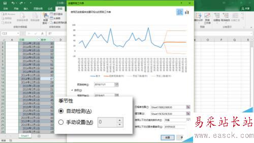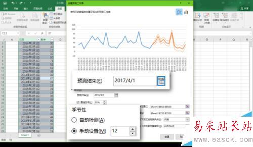 5、將“預測結束”日期選定到“2017/4/1”,將“季節設置”由“自動檢測”改為“手動設置”并將其值設置為“12”。這樣改的原因是,我們的原始數據為用戶每月發布的經驗篇數,數據范圍從 2014 年 1 月份開始,至 2016 年 4 月份結束,每個周期為 12 個月;而且需要從最后一期數據(2016 年 4 月份)開始,向后預測 1 年以內的數據。