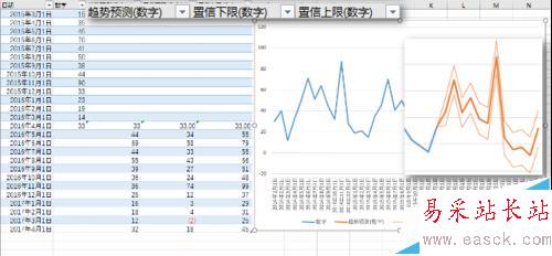 6、點擊向導窗口中的“確定”按鈕,Excel 將插入新的工作表,表中包含了原始數據,以及“趨勢預測”、“置信下限”、“置信上限”三列預測數據;當然,還包括一個預測圖表。由圖表可以說直觀地看出,根據 2014 年、2015 年兩個年度的數據,該經驗作者每年的 5 月份、10 月份為經驗創作的高峰期,因為這兩個月都有假期,基本上確定該作者是個宅男。