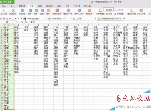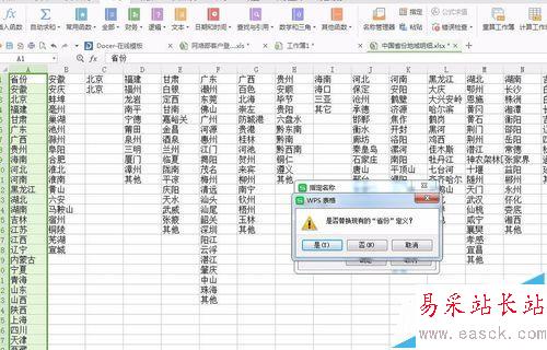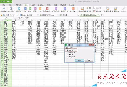 2、原始數據準備好之后,開始第一步選擇A列所有數據,選擇公式—指定,彈出指定名稱對話窗,勾選名稱創建于首行單擊確定,這時會提醒是否替換現有“省份”定義,選擇否。