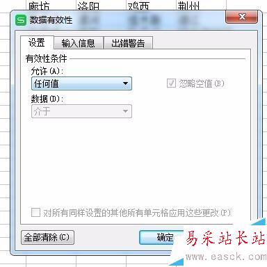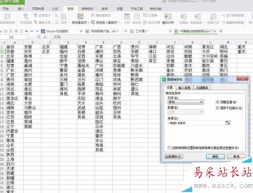 4、選中單元格后,選擇數據—數據有效性,彈出數據有效性對話窗口,設置允許:序列,忽略空值,提供下來箭頭;來源:選擇省份原始數據A2—A32,按F4絕對引用,這樣省份就做好了