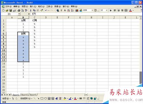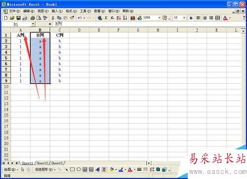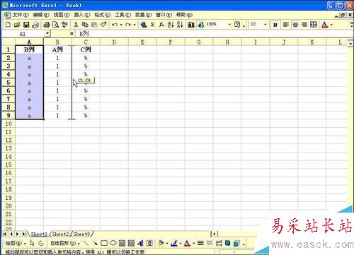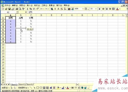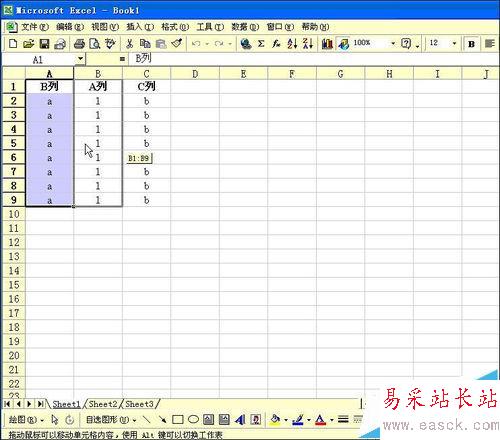 6、和剛才一樣,按住“Shift”鍵拖動“B列”內容到如圖顯示“工”狀位置,松開鼠標。