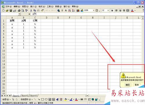 3、松開鼠標,會彈出警告提示,告訴你這樣做會替換目標單元格內容,我們當然點擊“取消”按鈕。