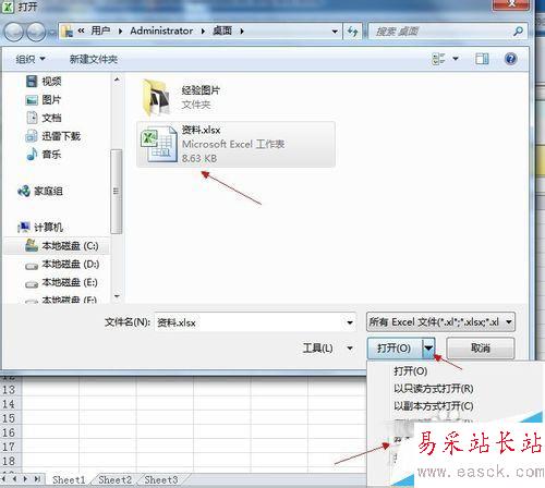 2、在打開的對(duì)話框選擇要打開的工作簿,單擊右下角【打開】旁邊的向下三角箭頭按鈕,在彈出的菜單選擇【在受保護(hù)的視圖中打開】命令