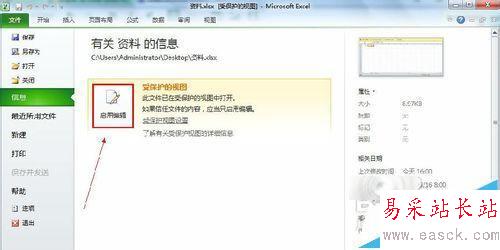 單擊【文件】按鈕,彈出的菜單選擇【信息】選項(xiàng)​,出現(xiàn)的面板單擊【啟用編輯】按鈕
