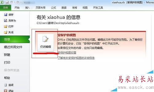 3、點(diǎn)擊文件菜單后彈出的界面默認(rèn)選擇的為信息界面,在信息界面內(nèi)點(diǎn)擊“仍然編輯”,圖中畫紅線的地方