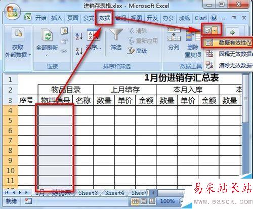 5、回到“1月”的表中,選中B列空白區域,點擊【數據】-【數據有效性】- 選擇下拉菜單中的【數據有效性】按鈕。