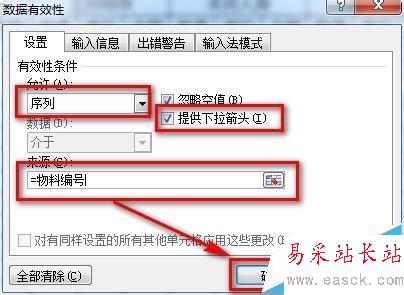 6、在彈出的界面中,按照下圖在【允許】的下拉菜單選擇“序列”,勾選【提供下拉箭頭】,來源處輸入:=物料編號。設置完成后點擊【確定】按鈕。