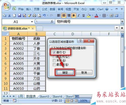 注意:運行的結果是將A2:A11的區域定義為“物料編號”這樣一個名稱,B2:B11的區域定義為“名稱”。Ctrl+F3可以查看定義的名稱。