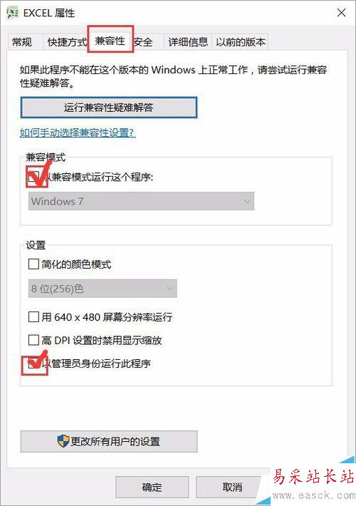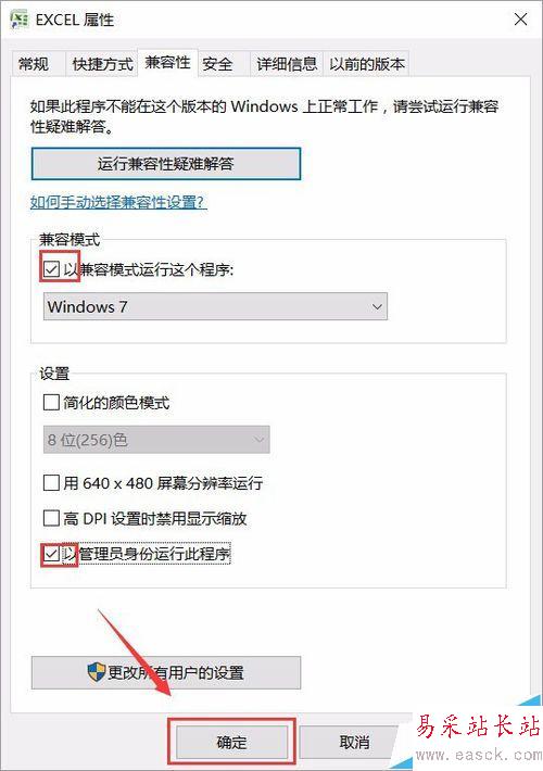 2、選擇兼容模式那個(gè)欄目,勾選兼容win7,以管理員身份運(yùn)行此程序。然后確定。