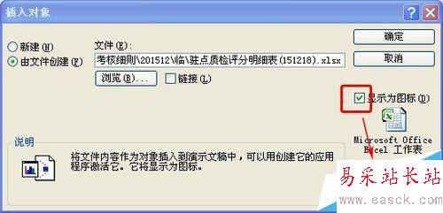 4、添加的文件可以用“鏈接”的形式顯示在頁面上,勾選“鏈接”即可,但用鏈接的話,添加的文件也需要放在固定文件夾才可以,而且發給別人后有時會容易鏈接地址出錯而打不開,所以用“顯示為圖標”就比較好,勾選“顯示為圖標”,可以點“更改圖標”為圖標改圖樣和標題名,如下圖標: