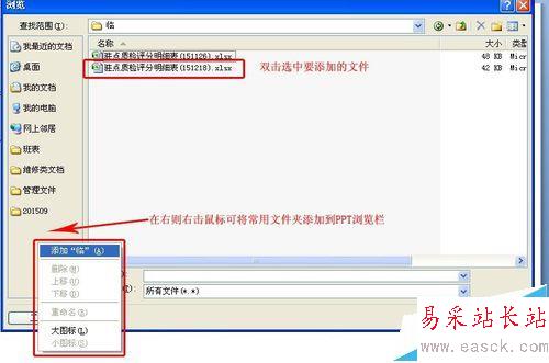 這里有個技巧:如果經常用PPT添加文件,可以將常用的文件夾添加到左則備選欄,這樣每次點瀏覽時都可以快速選中該文件夾了,在左則空白位置右擊鼠標,點添加即可。如下圖示: