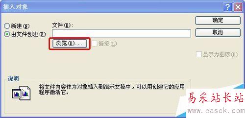 2、插入的文件可以自己新建一份,如果是要插入已有的文件,直接點擊瀏覽去找到該文件,如下圖示: