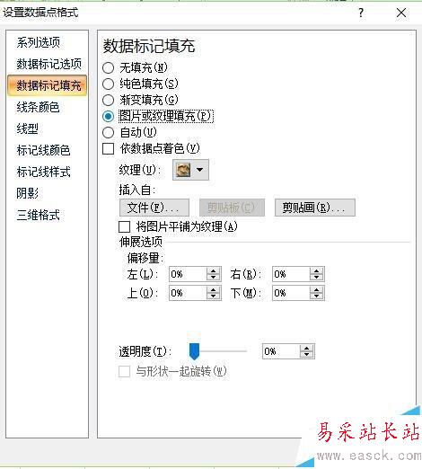 3、選擇數據標記填充,選擇圖片或紋理填充,選擇插入文件,找到PNG文件存放位置,確定