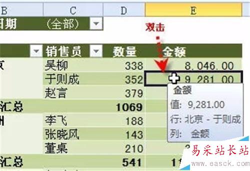 雙擊數據透視表中的數據,可在新的工作表中列出該數據的明細。
