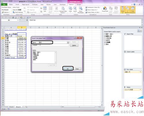 3、勾選字段“銷售人員”和“訂購額”,得到如下結果。我們需要在這個數據透視表里添加“提成”字段,提成按訂購額的百分之二來算。