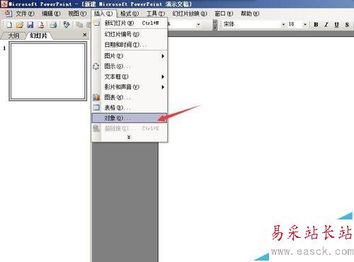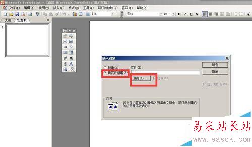 3、打開PowerPoint,依次點開插入——對象,彈出插入對象對話框。如圖