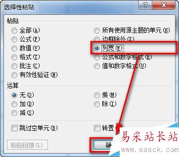 4、選擇【列寬】并點擊【確定】按鈕,這樣列寬也就復制過來了。