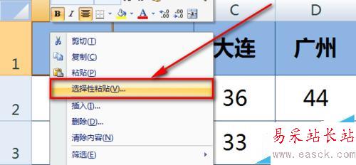 3、選中粘貼區域的最左上角單元格,鼠標右鍵,選擇【選擇性粘貼】。