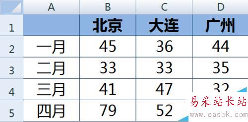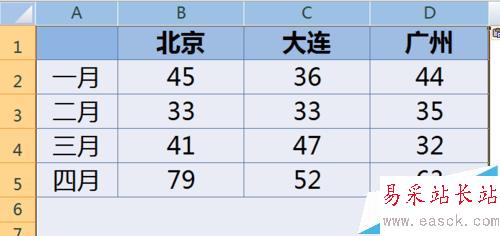 1、首先,選中原始表格的A1:D5區域,粘貼到新表格中。這時行高列寬都變化了。