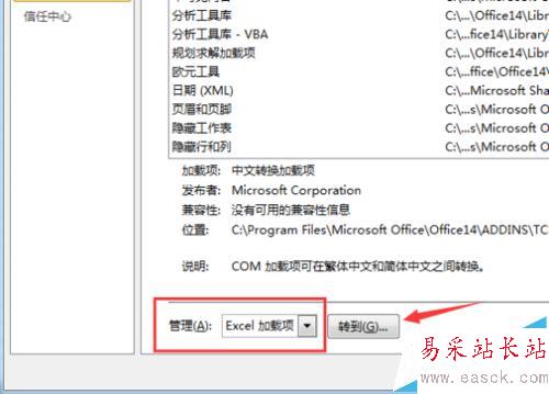 3、在“加載項”選項卡下的“管理”中點擊下拉菜單選擇“Excel加載項”,然后再點擊“轉到”按鈕。如圖所示;