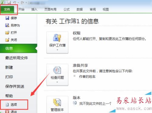 1、運行Excel2010表格編輯程序,依次點擊“文件”選項卡-->“選項”菜單。如圖所示;