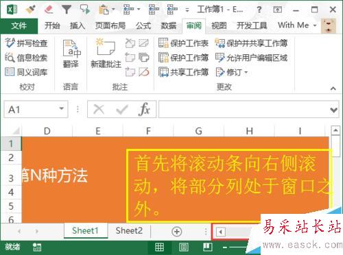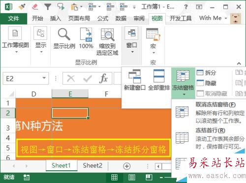 此方法很少用,一般“隱藏”起來,不太專注的朋友,一時半會兒解不開。首先將滾動條向右側滾動,將部分列處于窗口之外。此處將A、B、C三列在窗口之外,并選中E2單元格。點擊excel頂部菜單中的“視圖”,并找到“窗口”下的“凍結窗格”,點擊“凍結拆分窗格”即可。