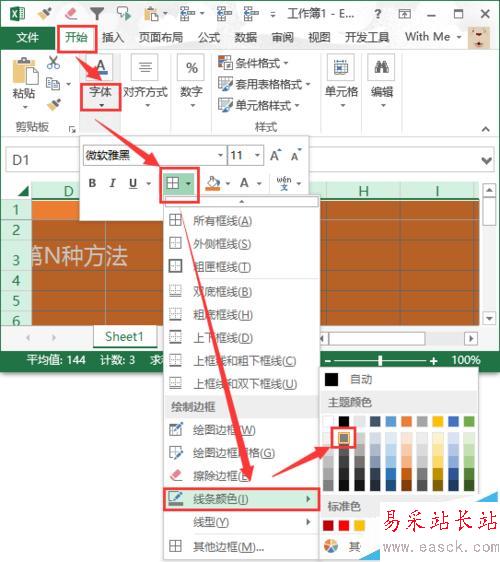 選中要隱藏的內容所在的單元格,在Excel頂部的菜單欄中,點擊“開始”選項卡,在“字體”欄目下,點擊“字體顏色(A)”旁邊的黑色下拉小三角,再彈出的顏色區塊中,選擇為橙色。這樣字體則和背景色融為一體,達到顯示效果的上的隱藏。