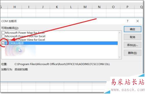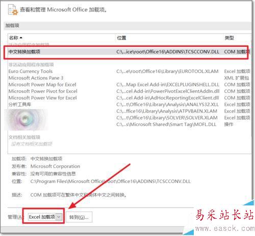 4、出現具體的加載項,可以查看活動中與非活動的加載項。Windows10中,中文轉換加載項存在,若安裝了翻譯軟件不是加載翻譯軟件的項目,