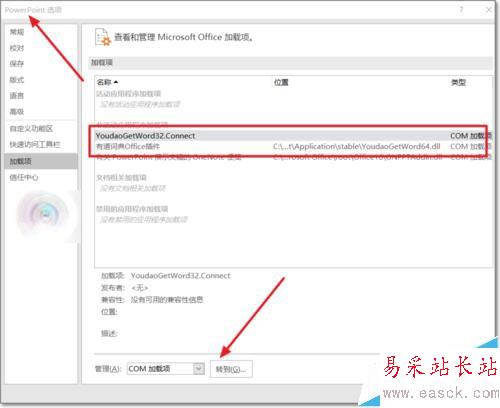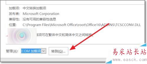 5、選擇加載項后,在管理點擊下拉菜單,自動選擇Com加載項。點擊轉到,對這個加載項進行刪除。