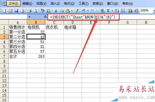 4、調(diào)用函數(shù)進(jìn)行匯總。單擊B2單元格,輸入公式=INDIRECT("Sheet"&ROW(B1)&"!B2"),這個(gè)函數(shù)里嵌套一個(gè)行號(hào)函數(shù)ROW,"Sheet"&ROW(B1)相當(dāng)于Sheet1,,括號(hào)內(nèi)的字符串表示引用第一張工作表的B2單元格數(shù)據(jù)。輸入好公式后按回車鍵確定。這時(shí)顯示數(shù)據(jù)32。注意ROW(B1)=1。