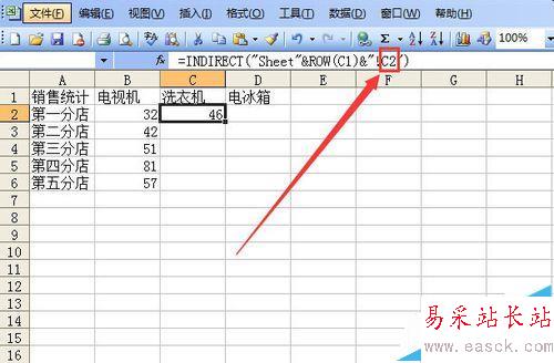 6、洗衣機(jī)的列也一樣,使用填充柄,由B2向右復(fù)制,然后把公式中的B2改成C2,row括號(hào)里的單元格自動(dòng)改成了C1。按回車鍵確認(rèn)。