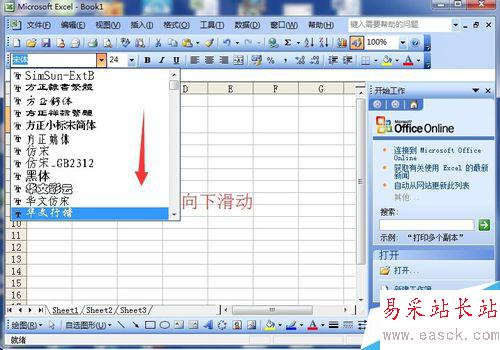 4.點擊字體旁邊的倒三角圖標,顯示出了字體的菜單,向下滑動混動條,如圖所示。