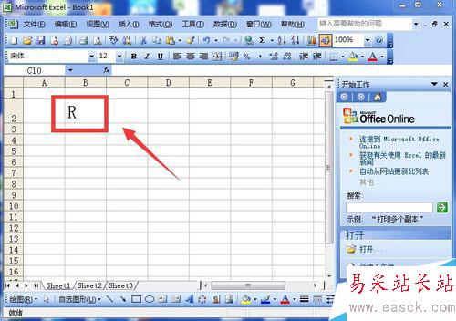 2.在這個空白的excel文檔中,選擇一個單元格,輸入字母“R”,如圖所示。