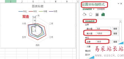 3、雙擊坐標軸——設置坐標軸格式——坐標軸選項——邊界,單位。根據需要進行設置。