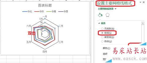 4、如圖所示,雙擊網格線——設置主要網格線格式——實線——顏色。