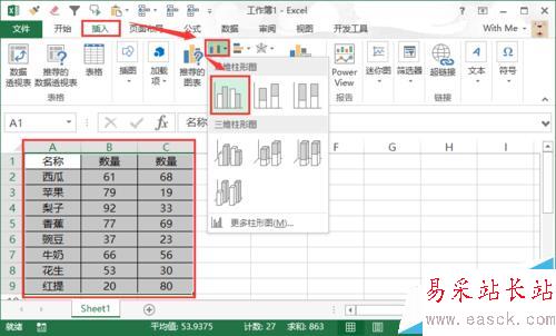 3、選擇模擬數據,按全選快捷鍵“Ctrl+A”,或者單擊"A列",并拖動選擇至C列。在頂部菜單欄中,找到“插入”,并選擇“柱狀圖”,添加圖表。