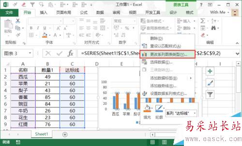 2、同樣的插入圖表,因為剛才已插入,修改數據后,圖表直接刷新為最新的樣式。在橙色柱子上,點擊右鍵,在彈出的菜單中,選擇“更改系列圖表類型”。