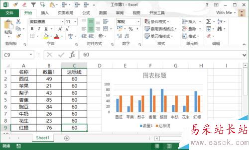 1、將模擬數據更改,在C1單元格設置為“達標線”,達標值設置為60。