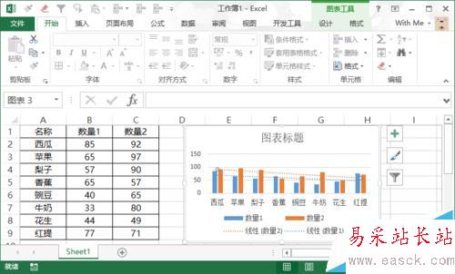 5、同樣的,用鼠標右鍵點擊橙色的柱子,用相同的方法,為橙色添加趨勢線,即可完成多條趨勢線。備注:如果是一個圖添加不同趨勢線,可以用多列相同的數據,然后添加到柱狀圖中即可。